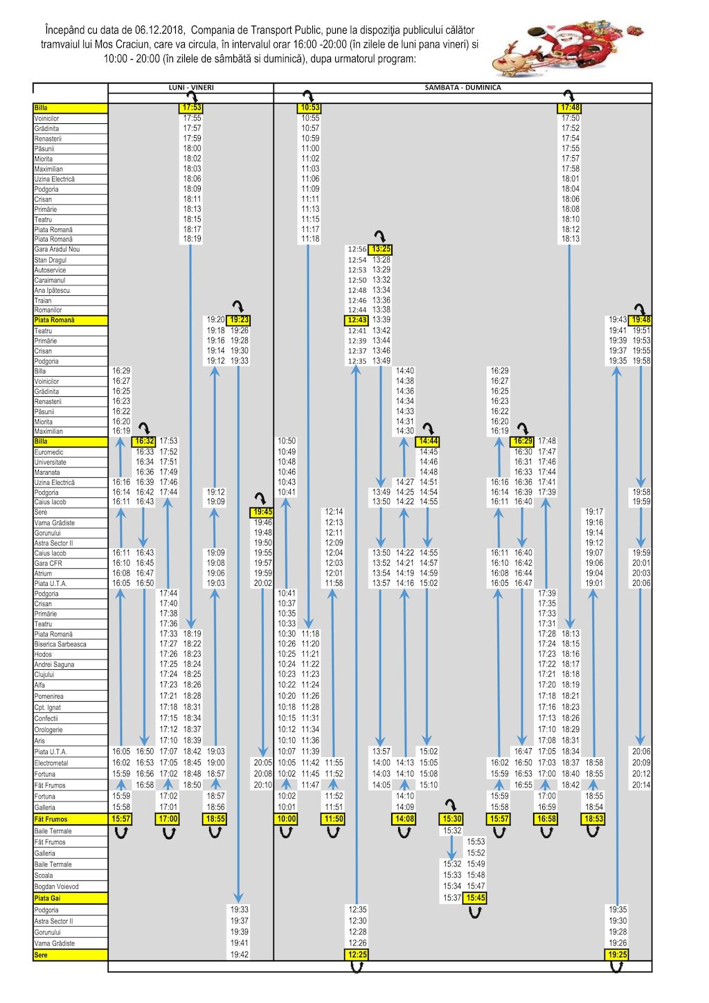 Începând cu data de 06.12.2018, Compania de Transport Public, pune la dispoziţia publicului călător tramvaiul lui Mos Craciun, care va circula, în intervalul orar 16:00 -20:00 (în zilele de luni pana vineri) si 10:00 – 20:00 (în zilele de sâmbătă si duminică)